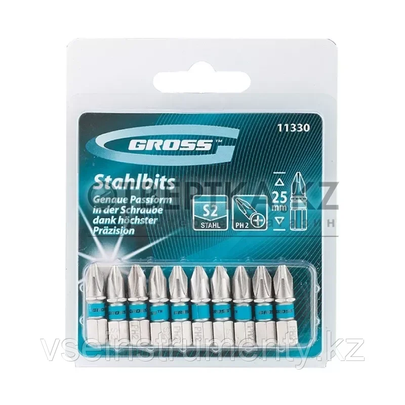 Набор бит торговой марки GROSS предназначен для использования в качестве насадок в ручном и механическом инструменте. Изготовлены биты из высококачественной инструментальной стали марки S2. Твердость бит составляет 58-62 HRС.Основу биты составляет шестигранный хвостовик размером 0,6 см (1/4 дюйма). Длина биты 25 мм, тип шлица — PH2 (крестообразный). В качестве защиты от контрафакта на каждой бите присутствует цветное кольцо с логотипом торговой марки GROSS. Набор из десяти бит упакован в жесткую термоформованную пленочную коробку (double blister) размером 105×85 мм.